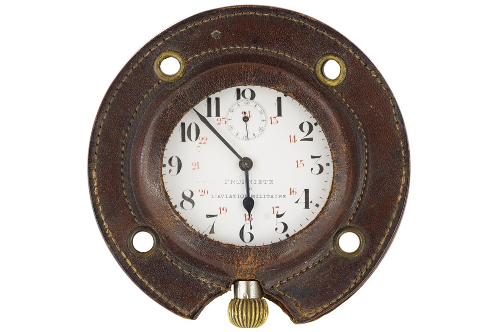 A relic of the Great War and a precursor to cockpit clocks, it illustrates how, in the early days of aviation, equipment was often adapted from the automobile industry, featuring here a movement stamped “Automobile Régulateur.”