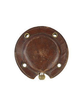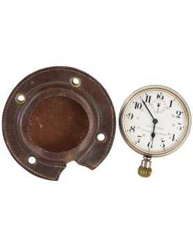 This fine timepiece remains in perfect working order and is complete, accompanied by its original leather mounting case. The removable watch was designed to be secured to the dashboard by means of the case’s eyelets.