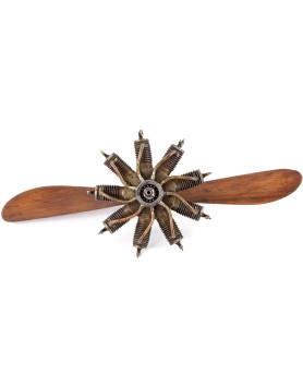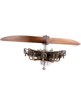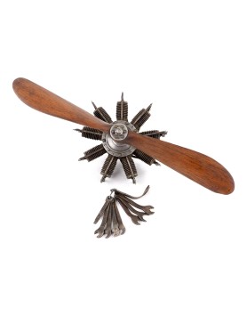 Jolie maquette en métal et en bois d'un moteur en étoile équipé de son hélice. C'est une maquette statique seule l'hélice peut être tournée pour la faire changer de position. C'est une maquette ancienne avec notamment un manque (une tige de culbuteur) et de petites réparations voir photos. la pièce est accompagnée d'un jeu de petites clés. C'est un très bel objet de vitrine difficile à dater mais qui doit au moins remonter aux années 30 et qui est probablement plus ancien !