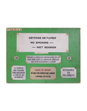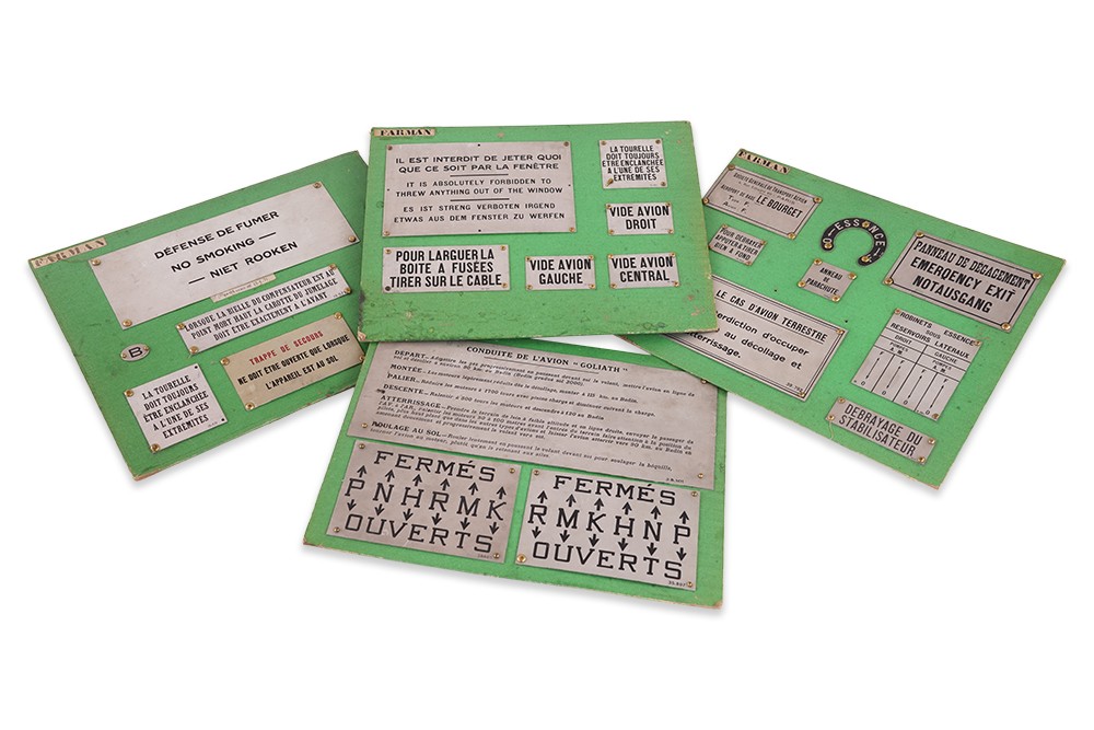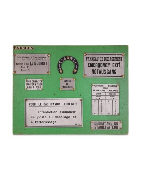 Ensemble des placards qui étaient apposés dans et sur l’avion, à l’attention du pilote, des passagers et des mécaniciens. Ceux-là ont été ont été fabriqués pour les avions de la Société Générale de Transport Aérien (S.G.T.A.) aussi appelée « les Lignes Farman ».