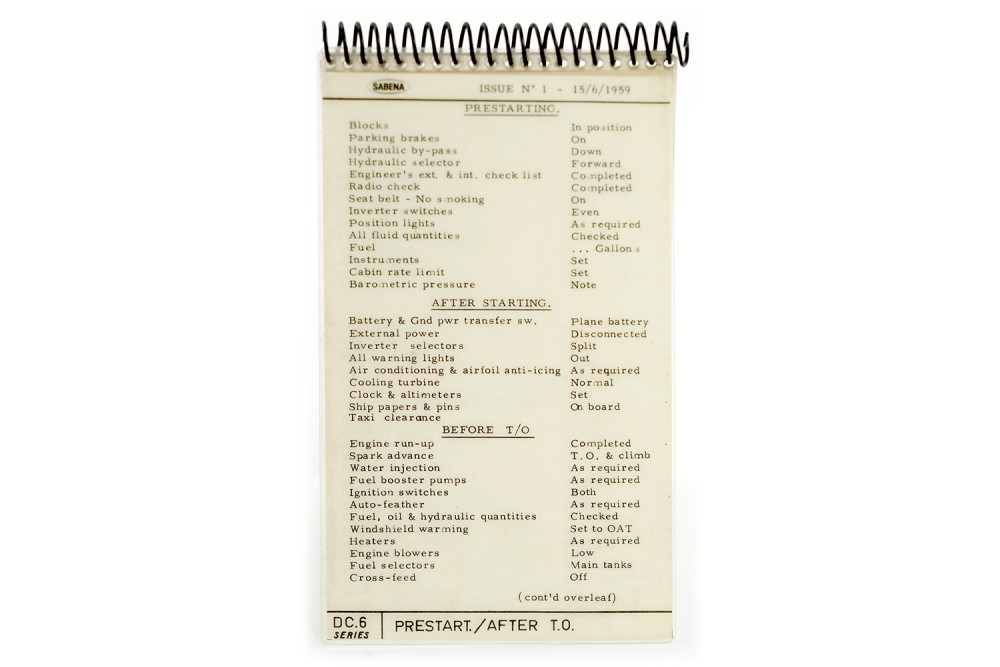 Rare petite Checklist de DC-6 de la compagnie SABENA daté 15/06/1959 composée de 5 feuillets plastifiés couvrant toutes les procédures. Document en excellent état : 18 cm x 10 cm.